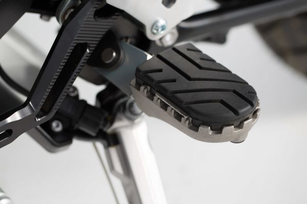 Our reasonably priced ION footrest kits allow the footrest to be mounted at its original height or lowered by 15 mm. Extremely durable and built to last, these stainless-steel footrests provide plenty of extra grip and are recommended for adventure, offroad and urban motorcycles. Hinges made from high-strength aluminum alloy ensure that the footrest can fold out of the way if the bike tips over. The removable rubber top surface reduces vibration, and the profile gives you a firm grip during offroad riding. To mount the bike-specific hinge adapter to the footrest sockets, the original attachments (springs, bolts, etc.) are used. Bike-specific Vehicle Type Approval for use on German roads is available.